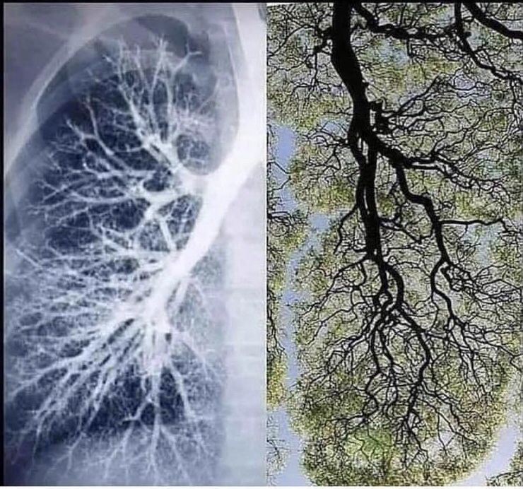 Thanks to God, Who has allowed us to develop new ways of exploring His creation, we are now able to “zoom in” deeper than ever before into the layers of creation. Our lungs, through which the Lord allows us to draw breath every day, branch off their twin bronchial trees at the same 1:1.618 ratio that most leafy trees do. There is poetry in the fact that these lungs, one filled with chlorophyll and the other with blood, are identical not only in their role, but in the way they are weaved together. We should not be surprised that all of biological creation respects this equation, since DNA itself swirls and swivels according to phi.