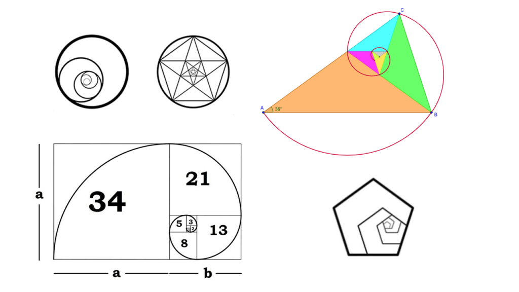 The second reason I prefer the term phi is more pragmatic: it’s important to remember that when we are looking for, and talking about, this design, we are not just considering spirals. Below are just a few examples of the phi ratio being expressed through different geometric patterns. The main thing to keep in mind is that the ratio is 1:1.618, which can be seen in the a:b ratio in the image below. Whether this mathematical principle is expressed as a spiral, triangle, square, or simply a distance of a certain length between multiple points, it is the same design we are talking about.